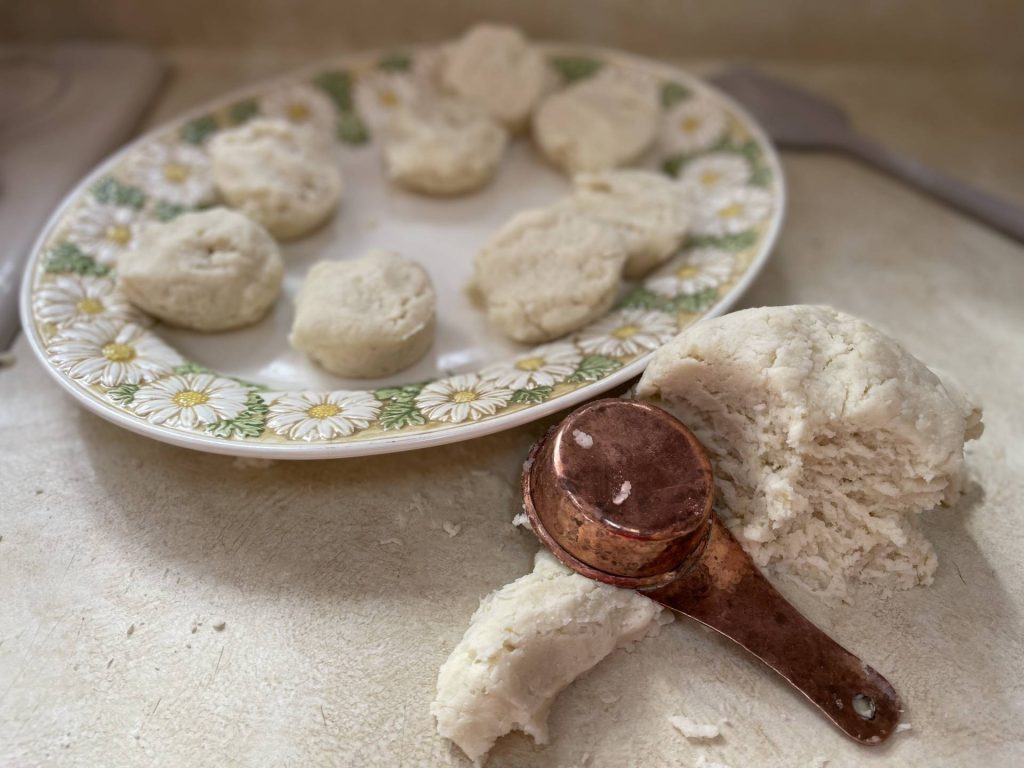 The next day a small amount of flour is stirred into the potatoes and the mixture is gently kneaded by hand to form a soft dough.