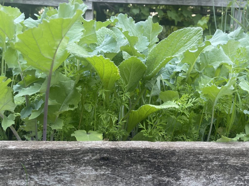Cabbage is a one-time harvest but is a substantial ingredient. A single head of cabbage can be made into an entire quart of sauerkraut or used over the course of multiple meals. Cabbage also stores well in the fridge, wrapped in a paper towel and placed in a plastic bag, as do all staple greens, but cabbage has the longest “shelf life” in the fridge.
