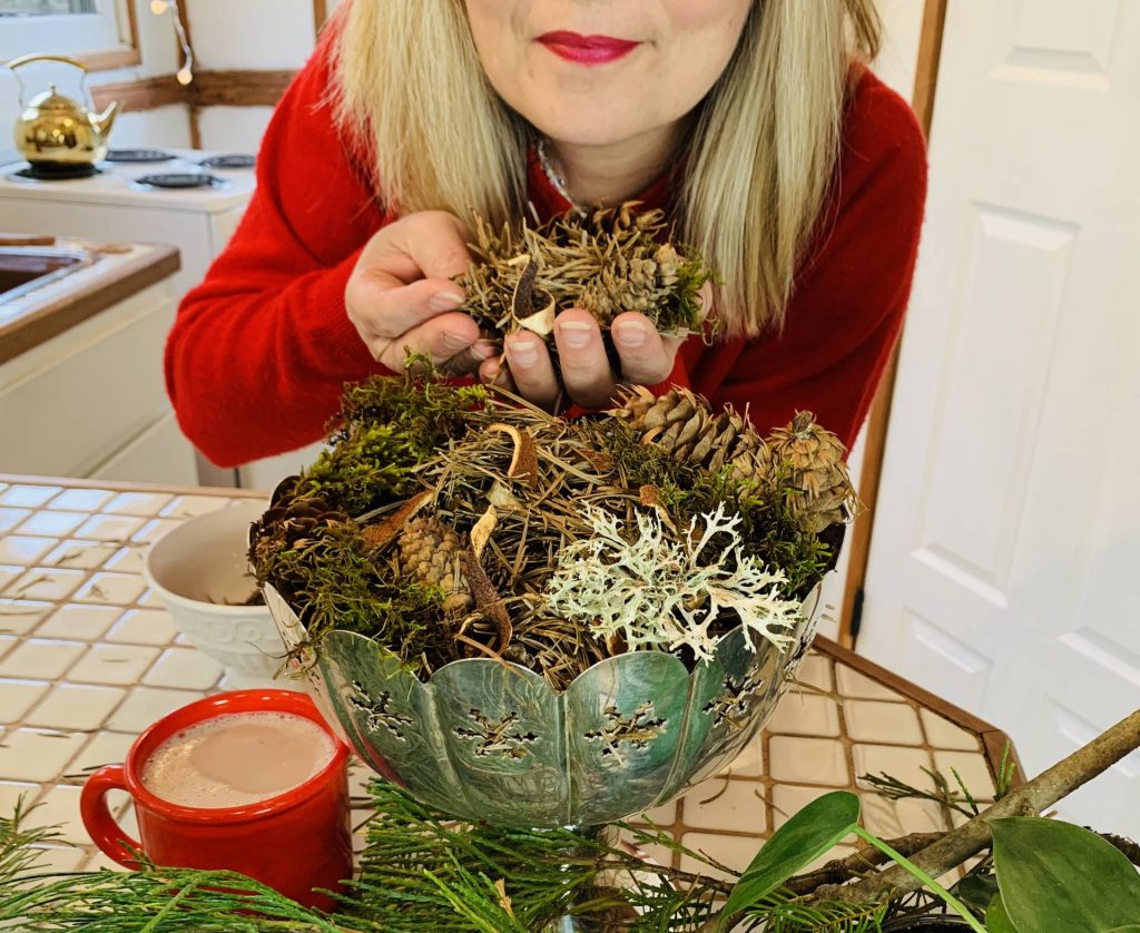 When mature, display Christmas Tree Potpourri in bowls around your home. Decorate the top with found items such as moss, lichen, more pinecones, leaves, etc.